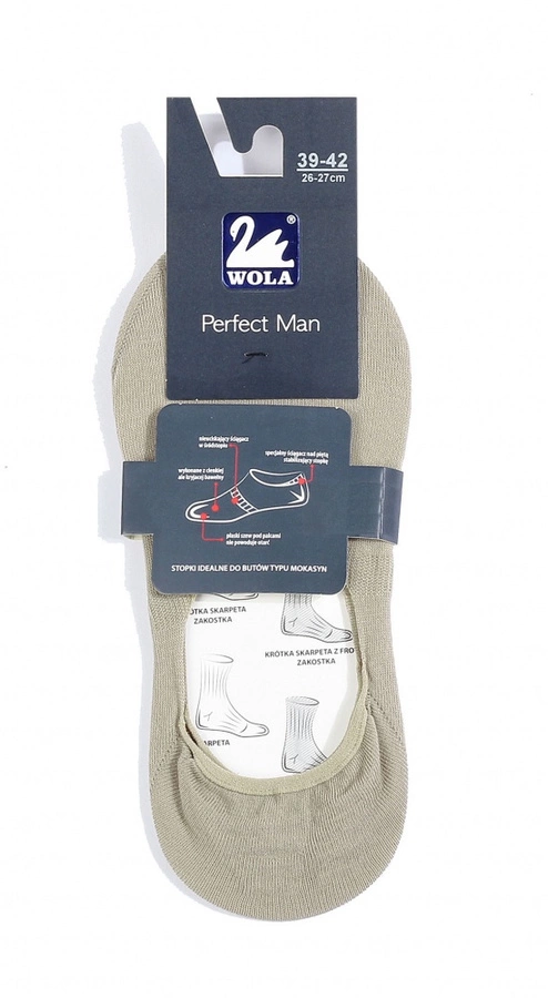 Stopki męskie z firmy Wola, idealne do butów typu mokasyny. Wykonane z cienkiej ale kryjącej bawełny z dodatkiem włókien elastycznych. Stopki uszyto z zastosowaniem płaskich szwów, nie powodujących otarć na stopach. Stopki mają nieuciskający ściągacz w sródstopiu i specjalny ściągacz nad piętą stabilizujący stopę.