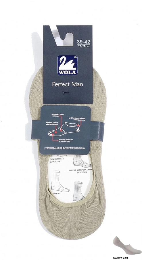 Stopki męskie z firmy Wola, idealne do butów typu mokasyny. Wykonane z cienkiej ale kryjącej bawełny z dodatkiem włókien elastycznych. Stopki uszyto z zastosowaniem płaskich szwów, nie powodujących otarć na stopach. Stopki mają nieuciskający ściągacz w sródstopiu i specjalny ściągacz nad piętą stabilizujący stopę.