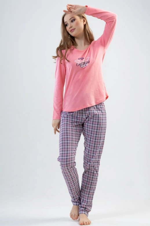 Piżama damska model 2010782514 od producenta Vienetta to komfortowy i stylowy zestaw, idealny na chłodniejsze wieczory. Wykonana z wysokiej jakości bawełny, zapewnia miękkość, wygodę i przewiewność. Góra z długimi rękawami ozdobiona jest subtelnym nadrukiem na przodzie, który dodaje jej uroku. Całość dopełniają długie, wzorzyste spodnie, tworząc harmonijny komplet doskonały do odpoczynku i spokojnego snu.