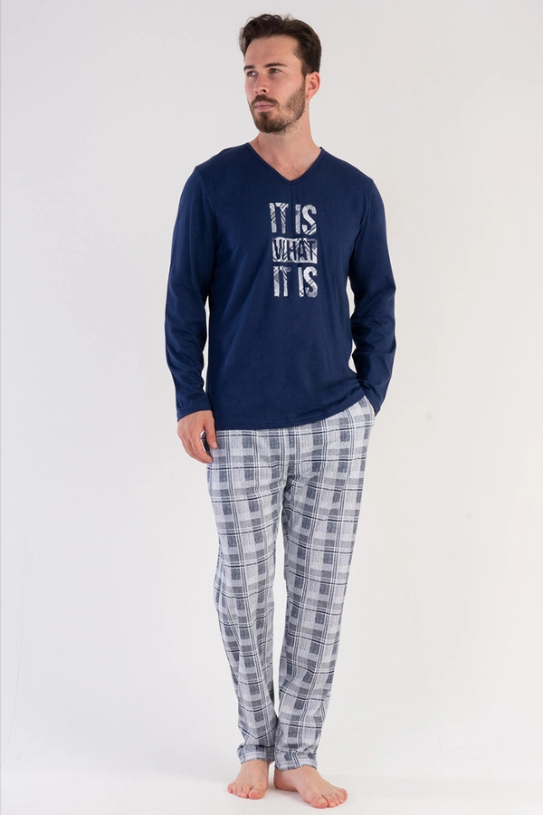 Piżama męska Vienetta model 3032981012 to komfortowy komplet wykonany z wysokiej jakości bawełny, zapewniający wygodę noszenia. Górę zestawu stanowi bluza z długim rękawem i dekoltem w kształcie litery V, ozdobiona subtelnym nadrukiem na przodzie. Uzupełnieniem są długie, wzorzyste spodnie wyposażone w praktyczne kieszenie po bokach, które podkreślają funkcjonalność i styl tego kompletu. Idealny wybór na chłodniejsze noce, łączący estetykę z wygodą.